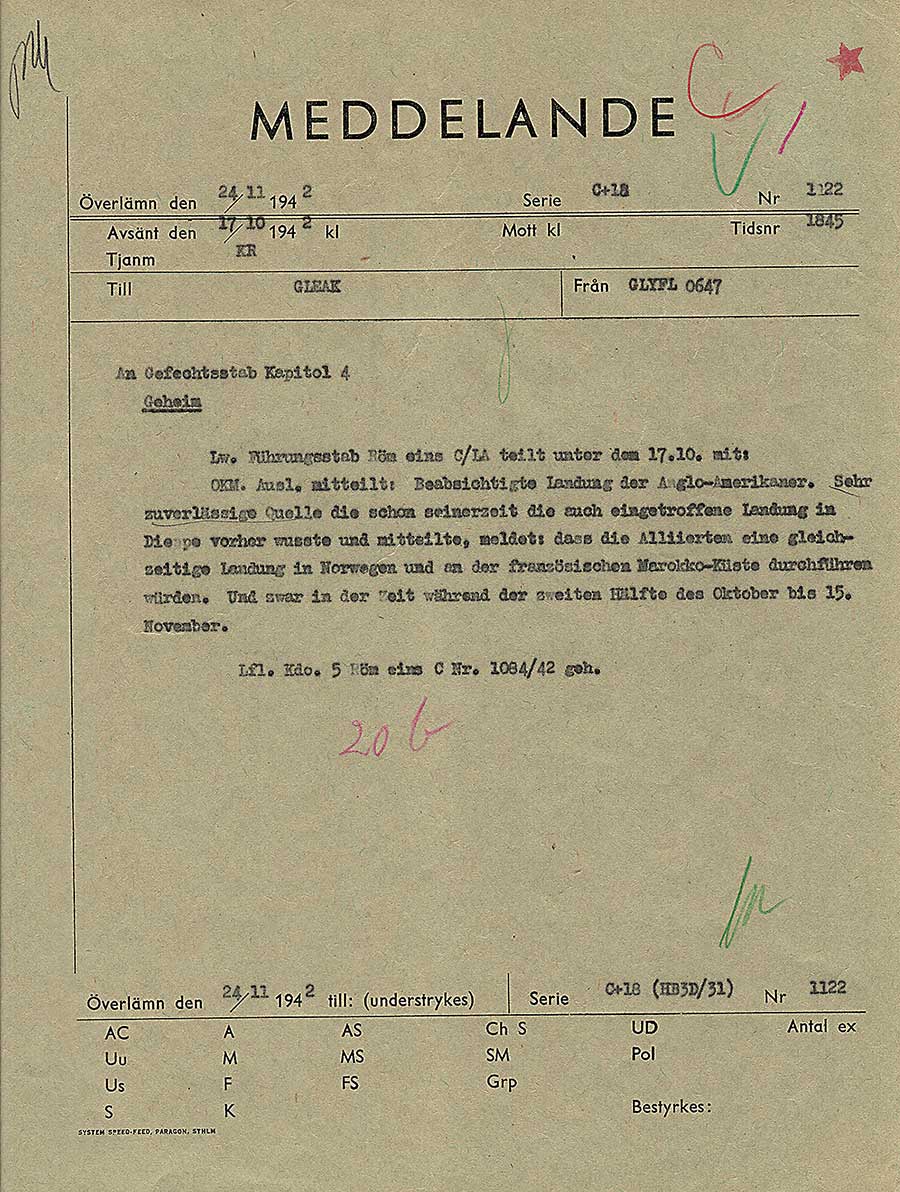 Tyska bedömningar om tänkbara allierade landstigningar som sänts 17 oktober 1942. Enligt uppgifter från en mycket tillförlitlig källa ska allierade landstigningar genomföras i Norge och Marocko mellan mitten av oktober och 15 november. Amerikanska landstigningar i Marocko genomfördes verkligen 8 november som en del i Operation Torch, så de tyska uppgifterna tycks åtminstone delvis ha varit korrekta. Notera att meddelandet inte forcerats och överlämnats av FRA förrän 24 november, sannolikt på grund av kapacitetsbrist eller på grund av att det tagit tid att forcera dagens nyckel. Det har alltså levererats vid en tidpunkt då det var inaktuellt. Ett bra exempel på att forcering och delgivning måste ske någorlunda snabbt för att underrättelser ska ha ett värde.