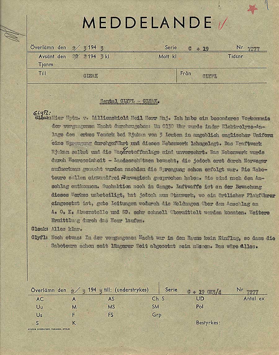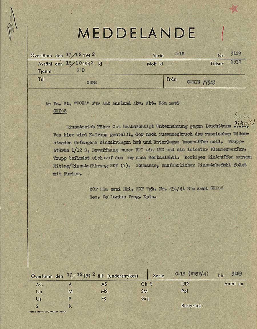 Orientering om tyska marinens planer för operation Rösselsprung till tyska flygvapnet i Norge. Detta meddelande sändes 20 dagar innan operationen inleddes. Förkortningen GKDOS betyder Geheime Kommandosache, det är sekretessgraden och motsvarar det vi skulle kalla Kvalificerat Hemlig i Sverige idag.