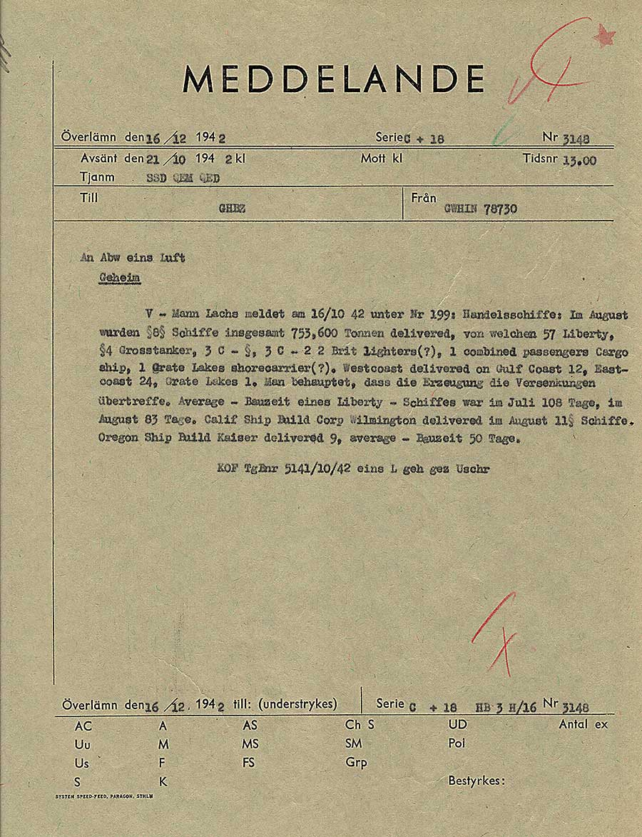 Meddelande med tyska underrättelseuppgifter om byggandet av Liberty-fartyg i USA. Uppgifterna är i stort sett riktiga. En V-mann är en uppgiftslämnare eller agent. V-mann Lachs verkar ha varit flitig, och har levererat ett antal rapporter om amerikansk krigsproduktion. De flesta verkar vara sammanställningar av uppgifter i öppna källor, förmodligen mestadels facktidskrifter. Blandningen av tyska och engelska i meddelandet är intressant. Man kan i detta meddelande se hur problem med sifferskift i forceringen kunde leda till konstiga tecken i sifferuppgifter.