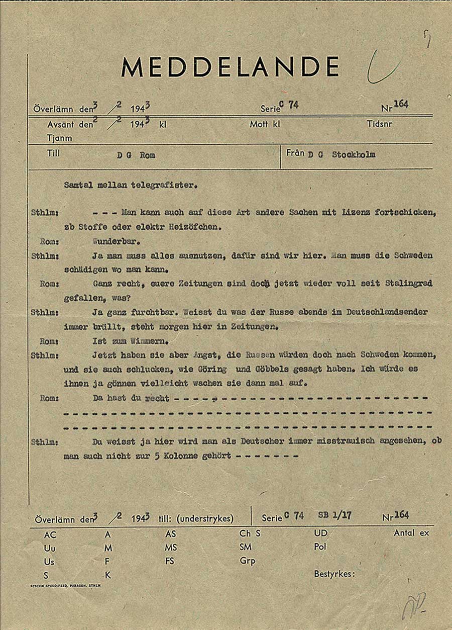 Sthlm: Men nu är de rädda, ryssarna kommer minsann till Sverige och slukar dem också, som Göring och Göbbels [sic] har sagt. Det unnar jag dem gärna, kanske vaknar de upp då.