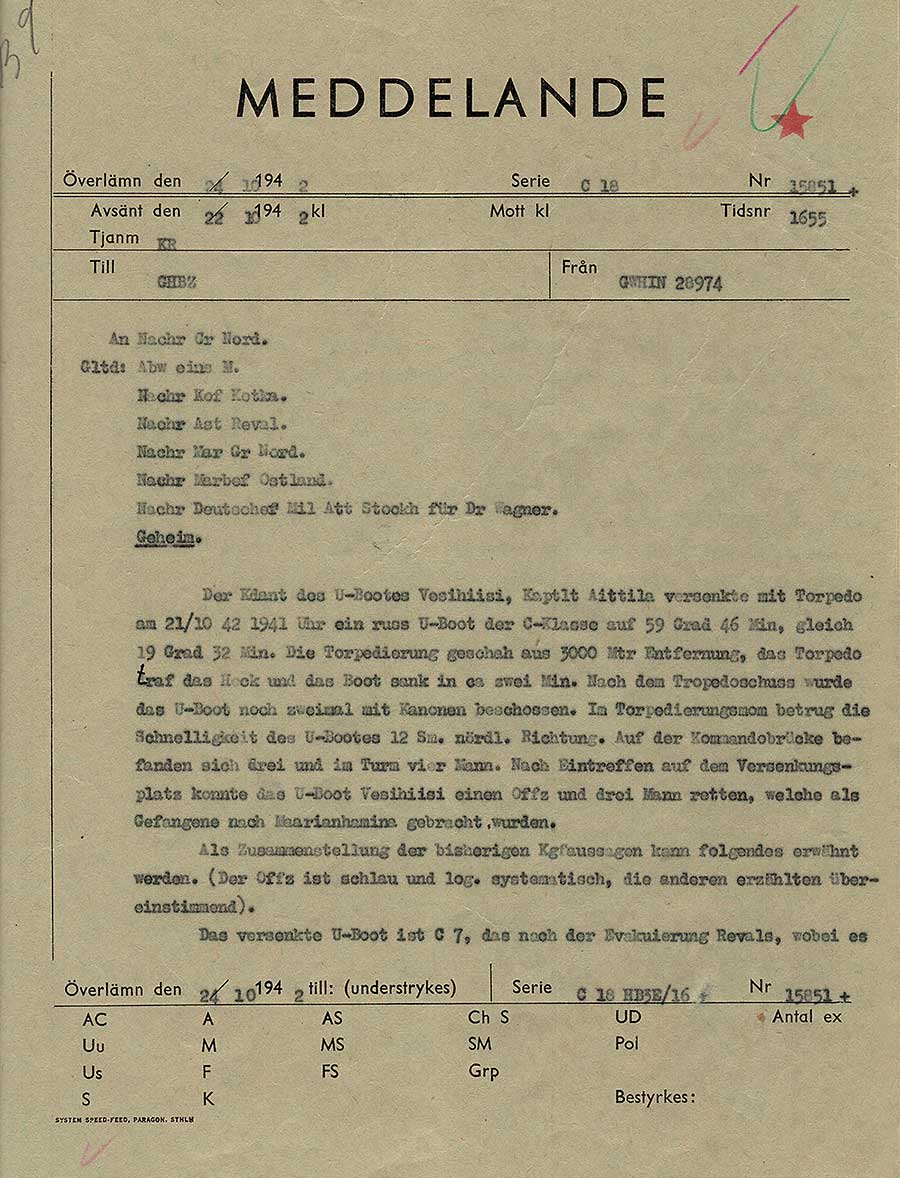 Meddelande från Fregattenkapitän Cellarius, chef för det tyska Abwehrdetachementet i Finland, om hur den finska ubåten Vesihiisi sänkt en Sovjetisk ubåt. Den sovjetiska ubåtens namn anges som C 7, i verkligheten hette den S 7, annars är uppgifterna korrekta. S 7 hade tidigare under 1942 sänkt flera svenska handelsfartyg. Vraket av S 7 hittades 1998 på svenskt territorialvatten utanför Söderarm.